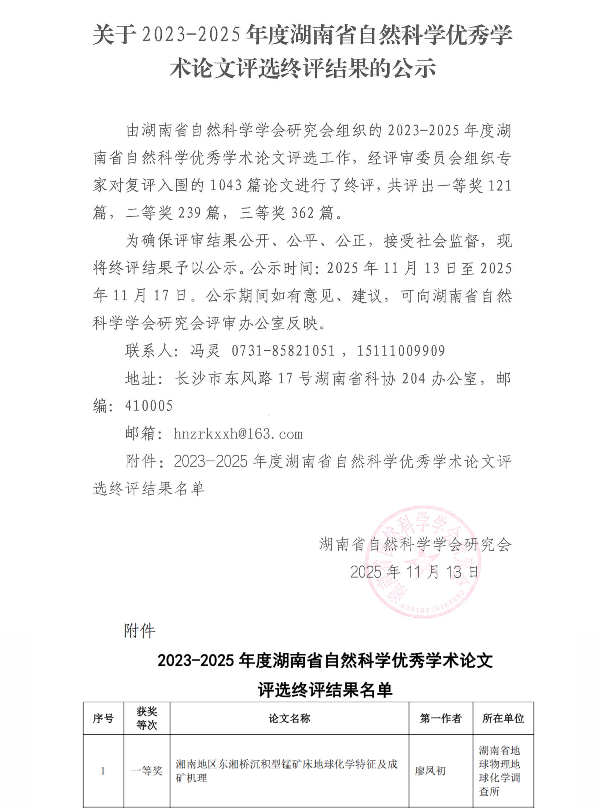 近日,2023-2025年度湖南省自然科学优秀学术论文终评结果公示,建筑工程学院岩土力学与地质过程团队刘湘华老师作为通讯作者的学术论文《湘南地区东湘桥沉积型锰矿地球化学特征及成矿机理》荣获一等奖。