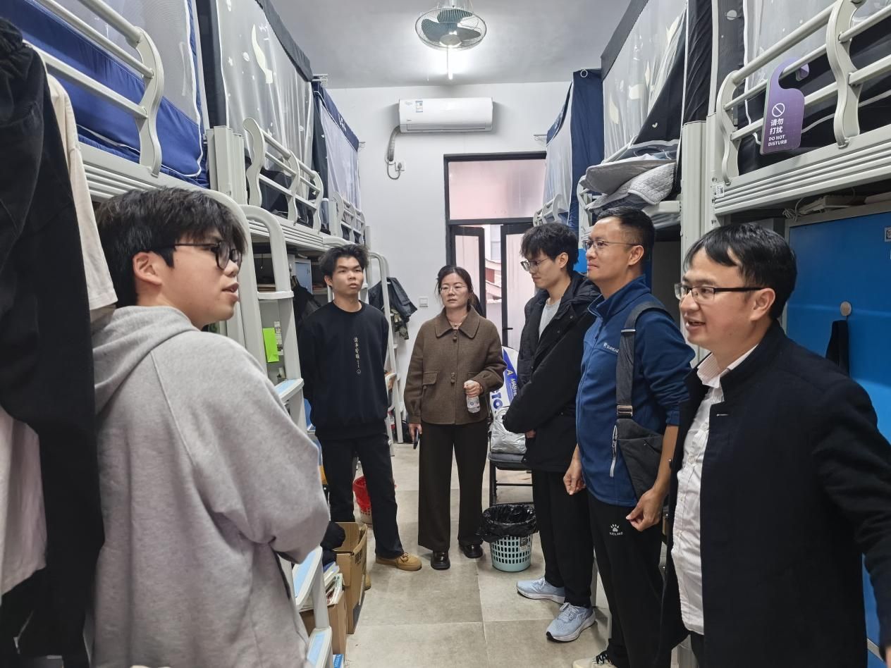走访过程中,学院领导仔细查看宿舍环境卫生、安全设施及生活保障情况,并与学生亲切交谈,详细询问学习进度、生活安排及未来发展规划。覃英宏鼓励学生合理规划时间,平衡学业与实践,不断提升综合素质;周月娥提醒学生注意用电安全,养成良好作息,遇到困难及时向学院反映;覃祖聪勉励大家珍惜大学时光,树立远大理想,在互助和谐的宿舍氛围中共同成长。