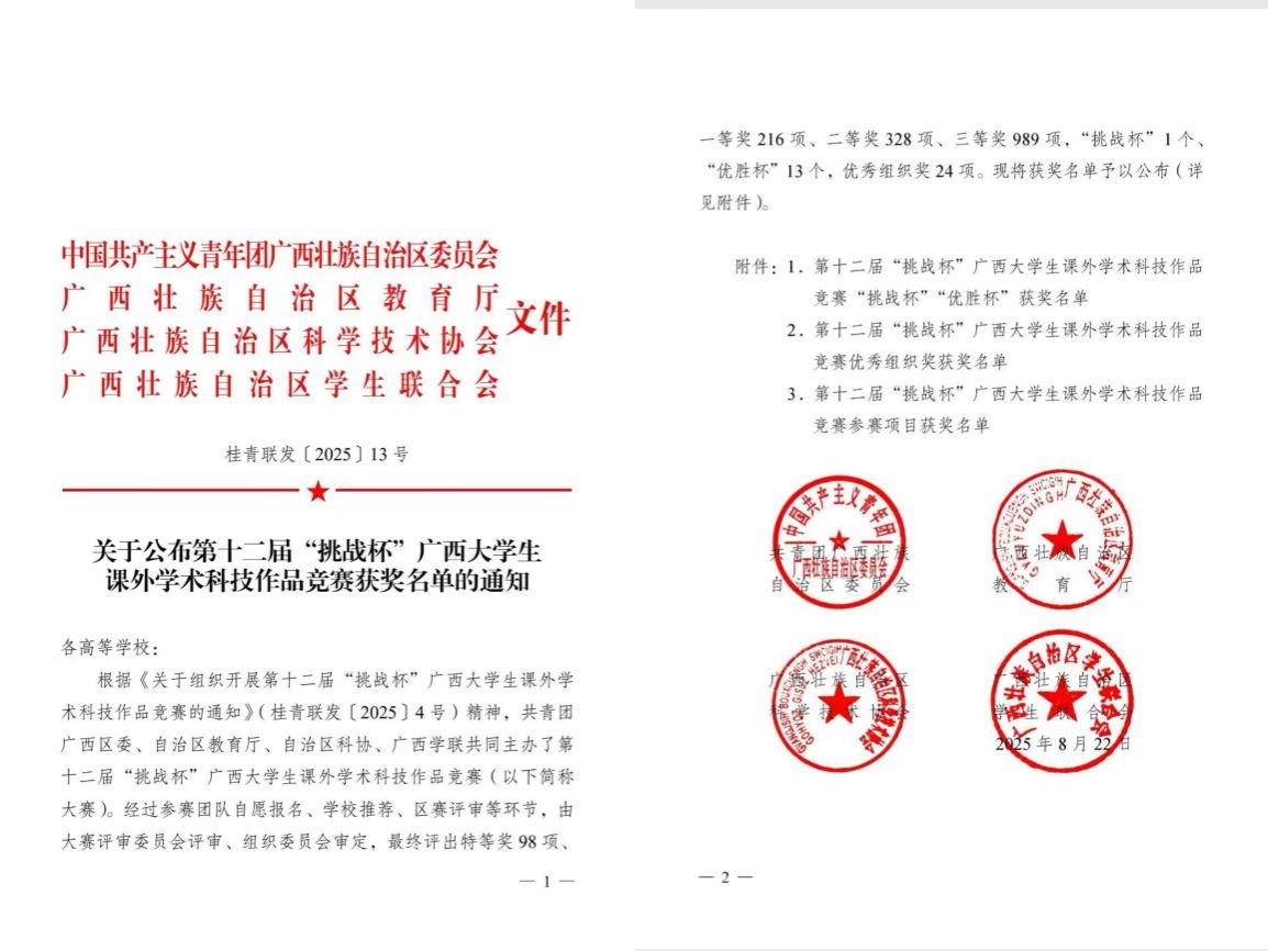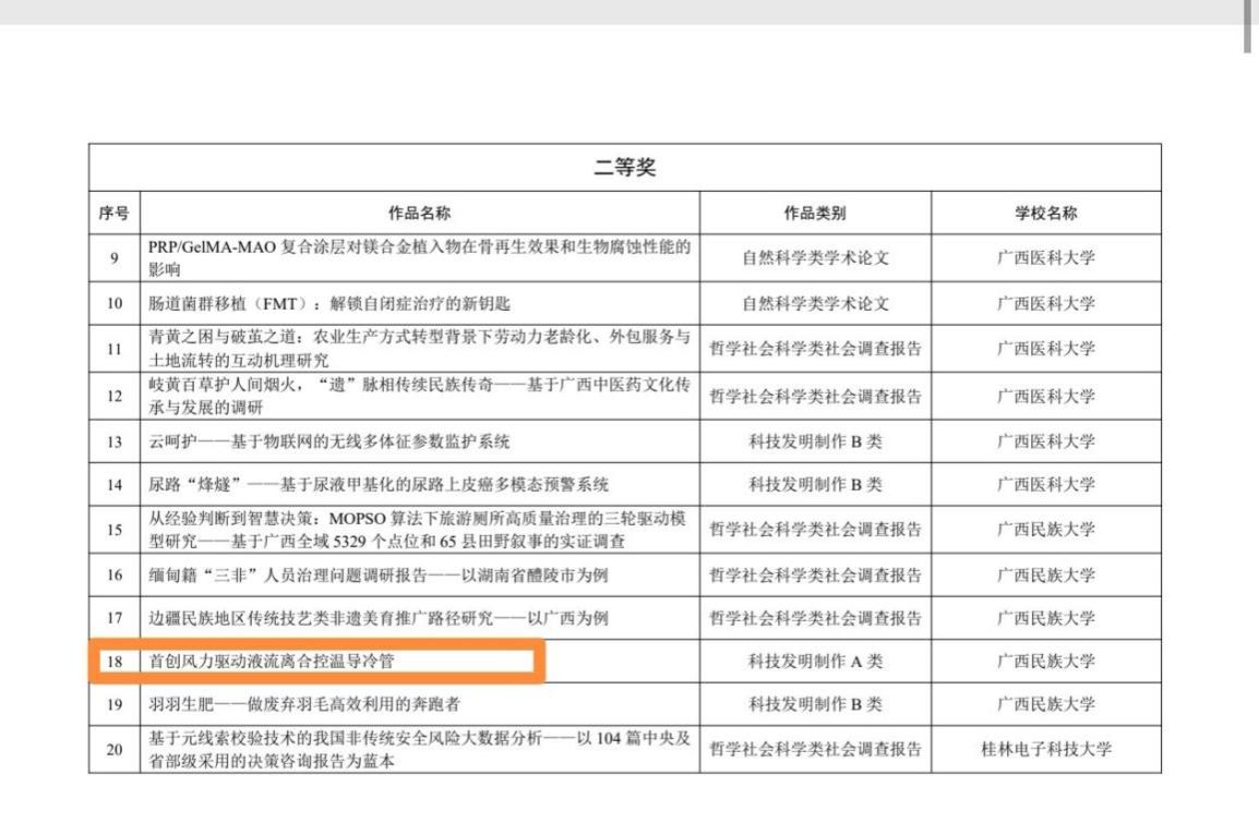近日,第十二届“挑战杯”广西大学生课外学术科技作品竞赛结果揭晓,建筑工程学院参赛团队凭借原创项目“首创风力驱动液流离合控温导冷管”荣获科技发明制作A类二等奖,为学院科技创新成果再添重要荣誉。